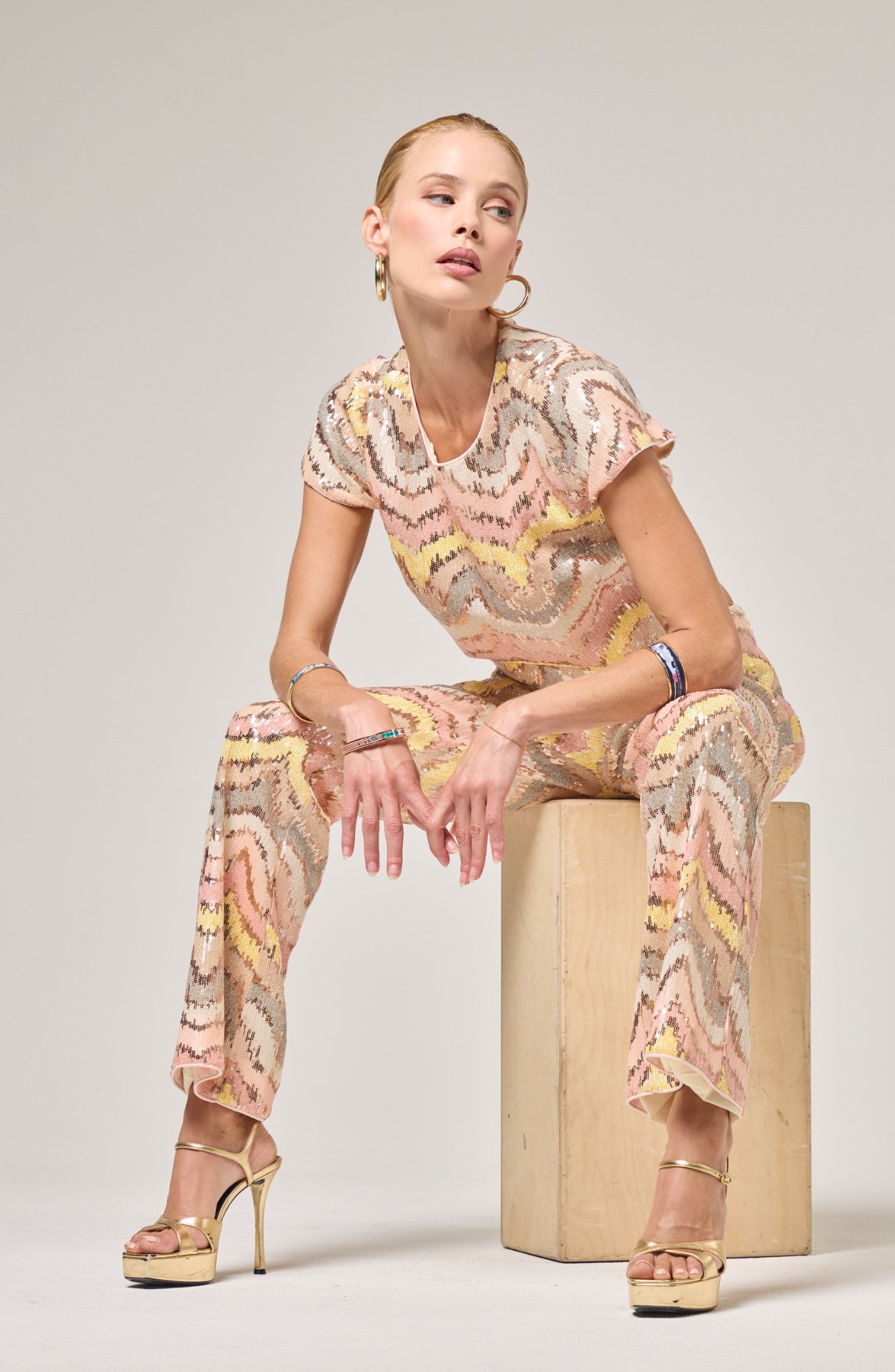 Shine from sunrise to soirée in the Katya Pant: a statement piece designed for effortless glamour. Cut in a flattering straight-leg silhouette, this sequin knit pant features a soft pastel wave pattern with hints of gold, blush, and taupe for a subtly luminous finish. Pair it with the matching Katya Top for a coordinated look that moves with you from poolside lunches to evening cocktails.