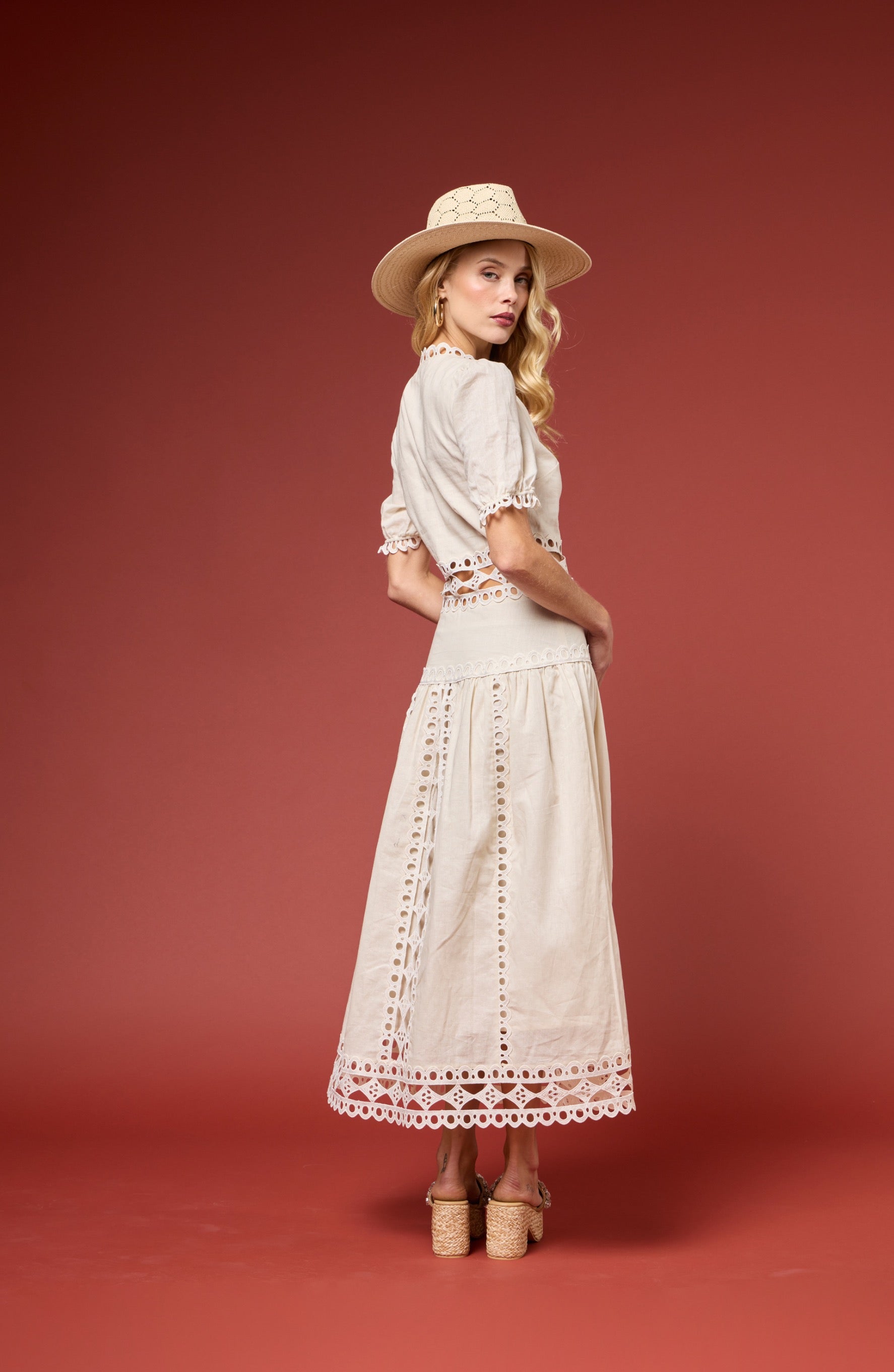 Where elegance meets ease. Made from luxurious linen and airy cotton voile, this enchanting dress features a delicate cut out at the waist to enhance your shape, offering a playful yet feminine silhouette.