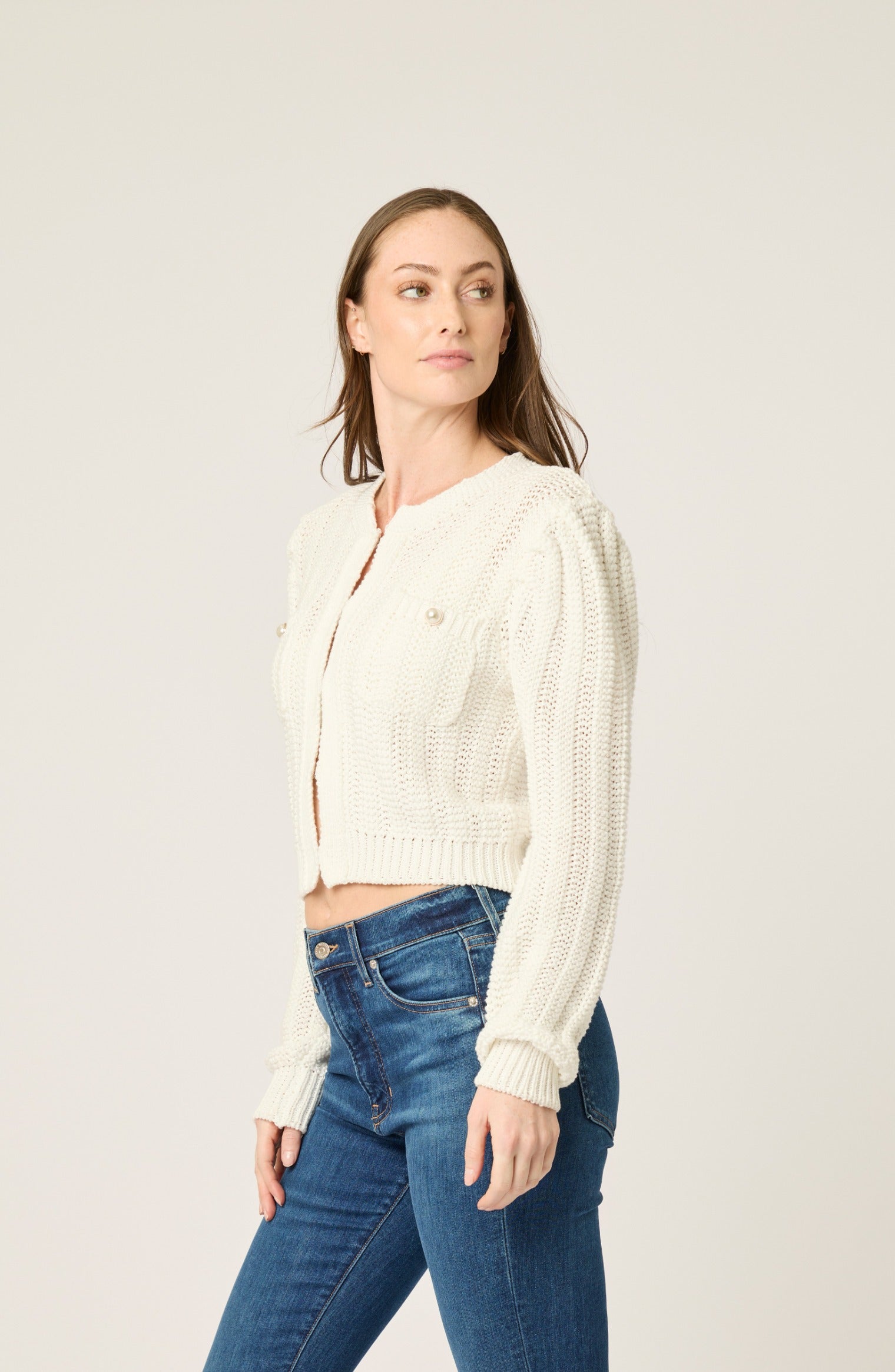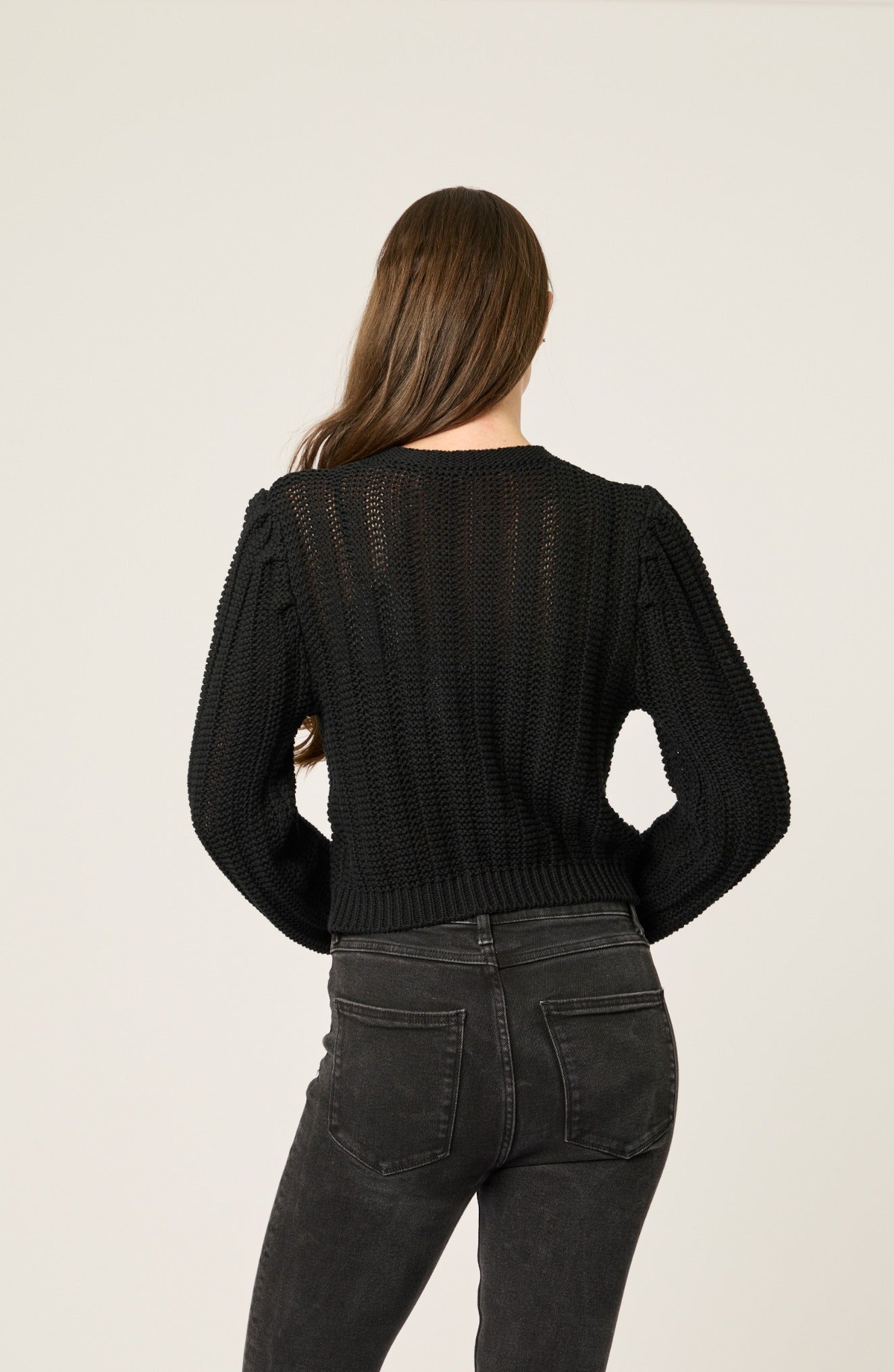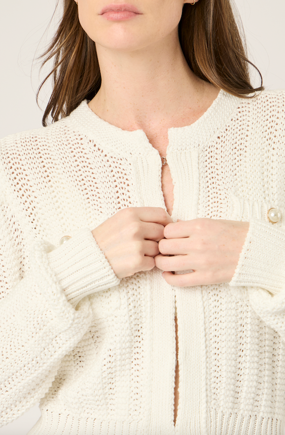 A modern twist on classic knitwear, this sweater combines elegance with edge. Designed with a body-skimming fit, it features pearl-snap chest pockets that bring a touch of polish, while hook-and-eye closures along the center front create a sleek, refined finish. Pleated sleeves add exaggerated volume for a statement silhouette that balances sophistication with contemporary flair.