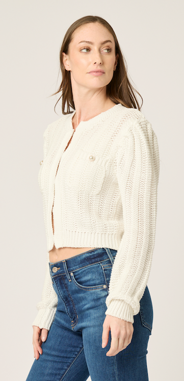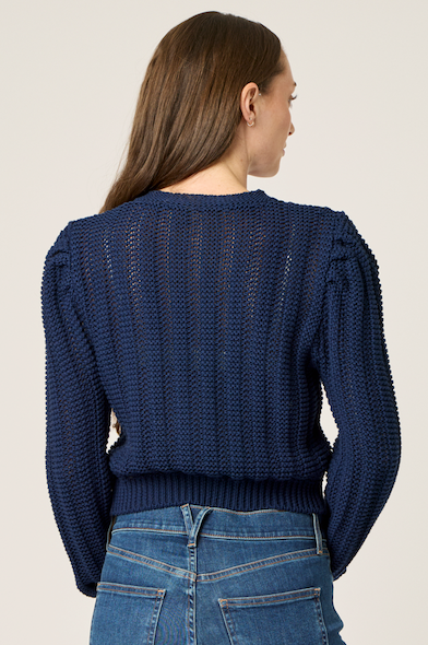 A modern twist on classic knitwear, this sweater combines elegance with edge. Designed with a body-skimming fit, it features pearl-snap chest pockets that bring a touch of polish, while hook-and-eye closures along the center front create a sleek, refined finish. Pleated sleeves add exaggerated volume for a statement silhouette that balances sophistication with contemporary flair.