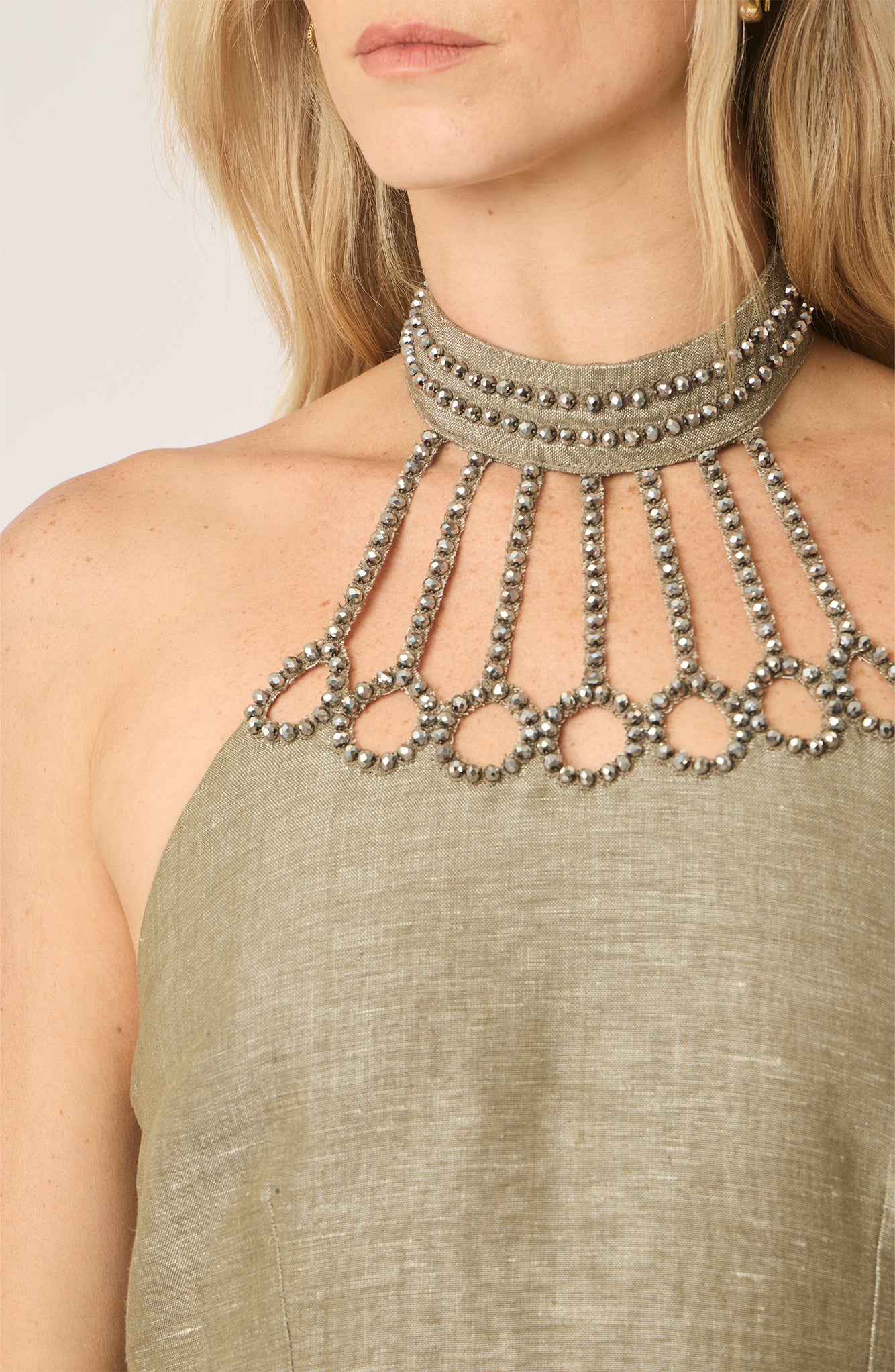 The Clarissa Top in Olive is a statement halter crop top designed for nights out, special events, and summer parties. It features a high choker neckline with rhinestone-embellished straps that cascade into circular cutout detailing across the chest, plus matching beaded cutouts at the waist for a flattering peekaboo effect. Crafted in a textured olive woven fabric, this fitted top pairs perfectly with the matching skirt, wide-leg trousers, or tailored denim for an elevated, resort-ready look.
