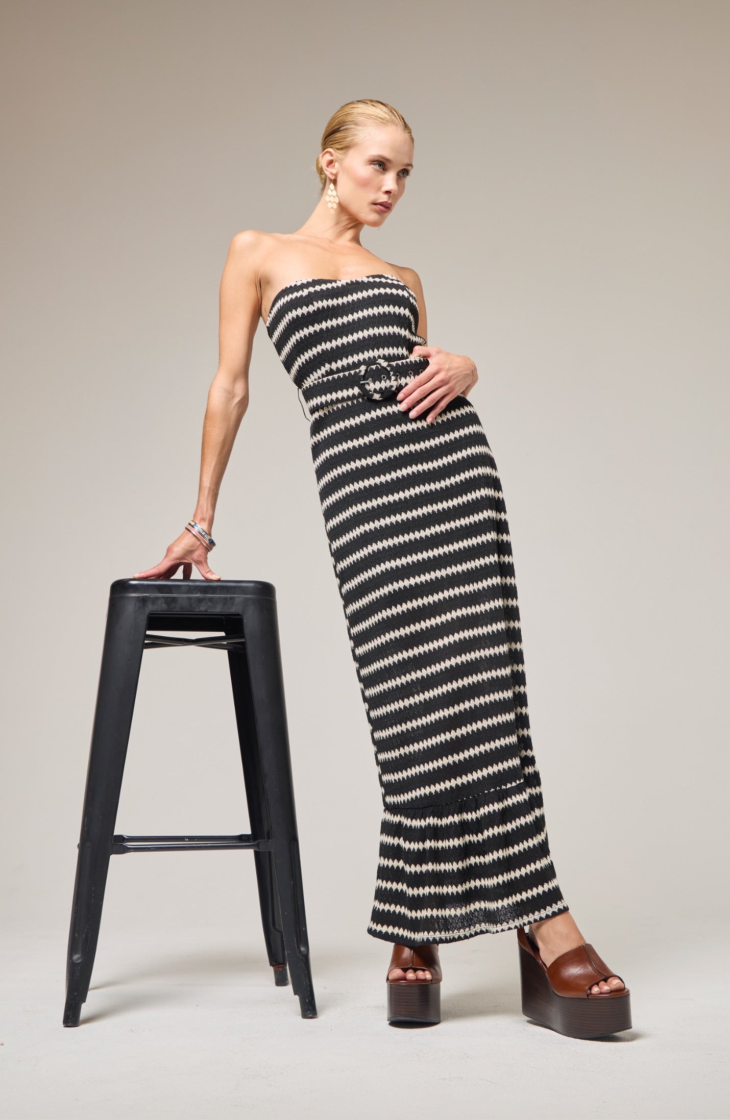 The Lilo Knit Dress is a strapless knit maxi in cream and black with a bold chevron stripe, designed to skim the body and flare softly at the hem. Crafted from a specialty knit and fully lined in breathable cotton voile, it features a removable self-belt with circle buckle to define the waist and silicone gripper tape for a secure, stay-put fit. Finished with an invisible side zipper, this column dress is made for seaside cocktails, destination weddings, and elevated summer nights.